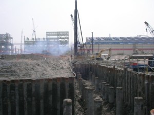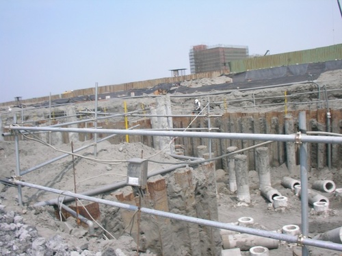 巨大的龐然大物是打樁機,為的是將無數的樁頭打入地底。可別看那樁頭露出那短短的一截,在場所看到的每根樁頭可是有數十米長。打樁頭的目的,是為了預防之後蓋好的基礎設備下陷。