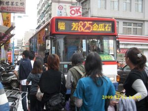 前往金瓜石的公車。適逢假日。超多的人潮。之中還參雜著許多的語言、港話、日語、英語…以及各種可可不懂的對話。