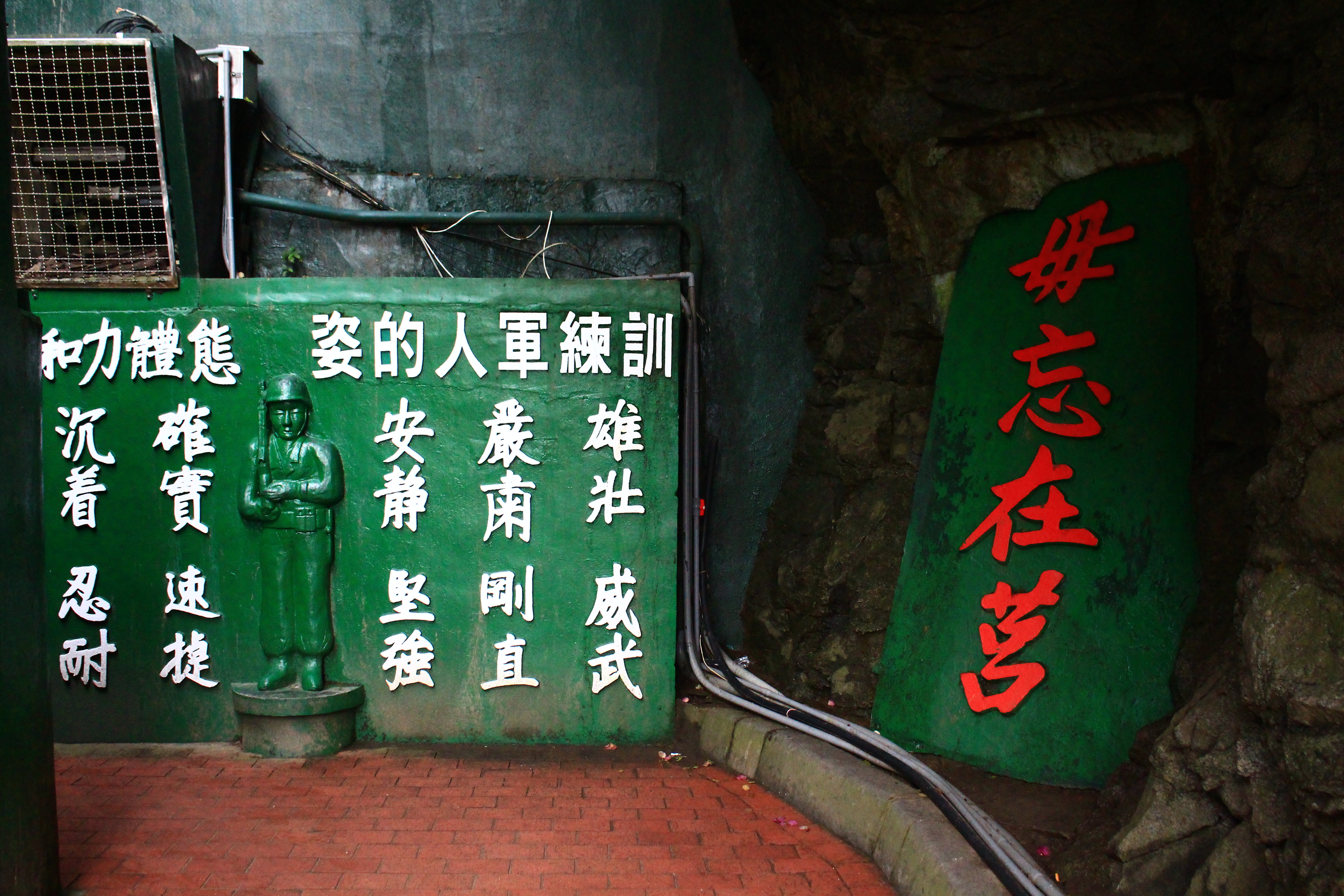 一入山洞,整個溫度驟降,是一種涼爽的感覺,夾帶著濃厚的濕氣。洞口右邊的水泥牆,聽說早期右邊為士兵寢室,因為坑道內非常潮濕的緣故,聽說早期,士兵起床後第一件事情是曬棉被。