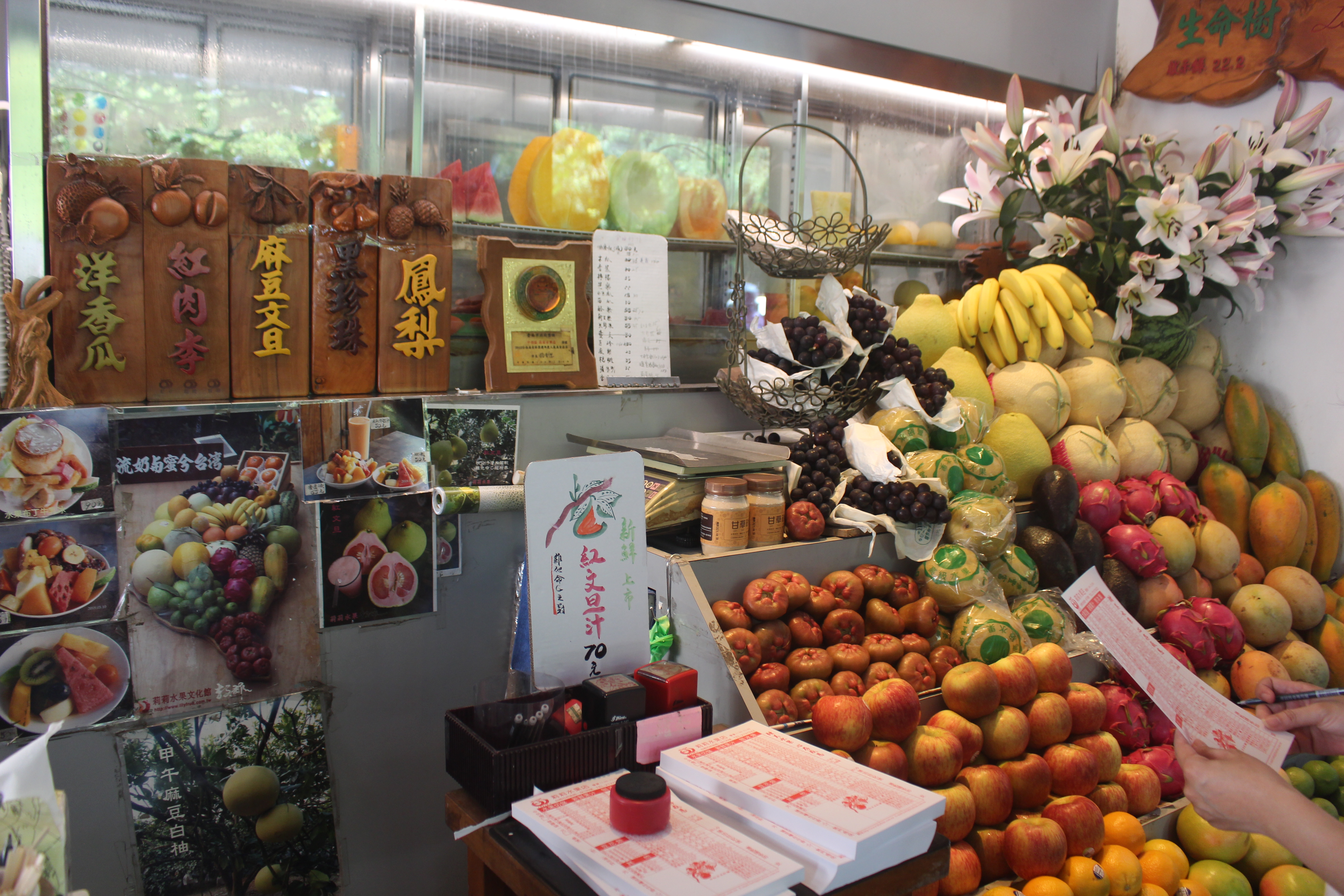 走近櫃檯,聞到的是陣陣的水果香,琳琅滿目的水果擺在眼前,依照可可過往的經驗,能散發出香味的水果,其配送應該是產地直送。