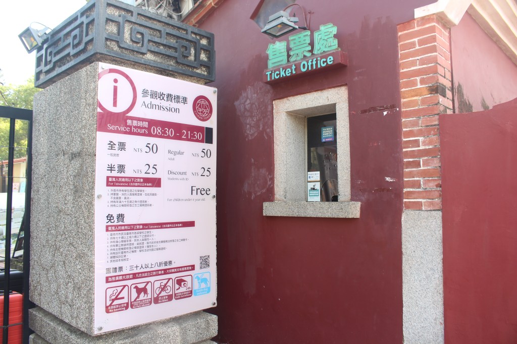 Tickets are required to enter the venue. Tickets for most historic sites in Tainan are the same. The full ticket is 50 TWD for friends from other counties and cities, and 25 TWD for children and students with ID cards. People in Tainan City can enter for free with ID cards.