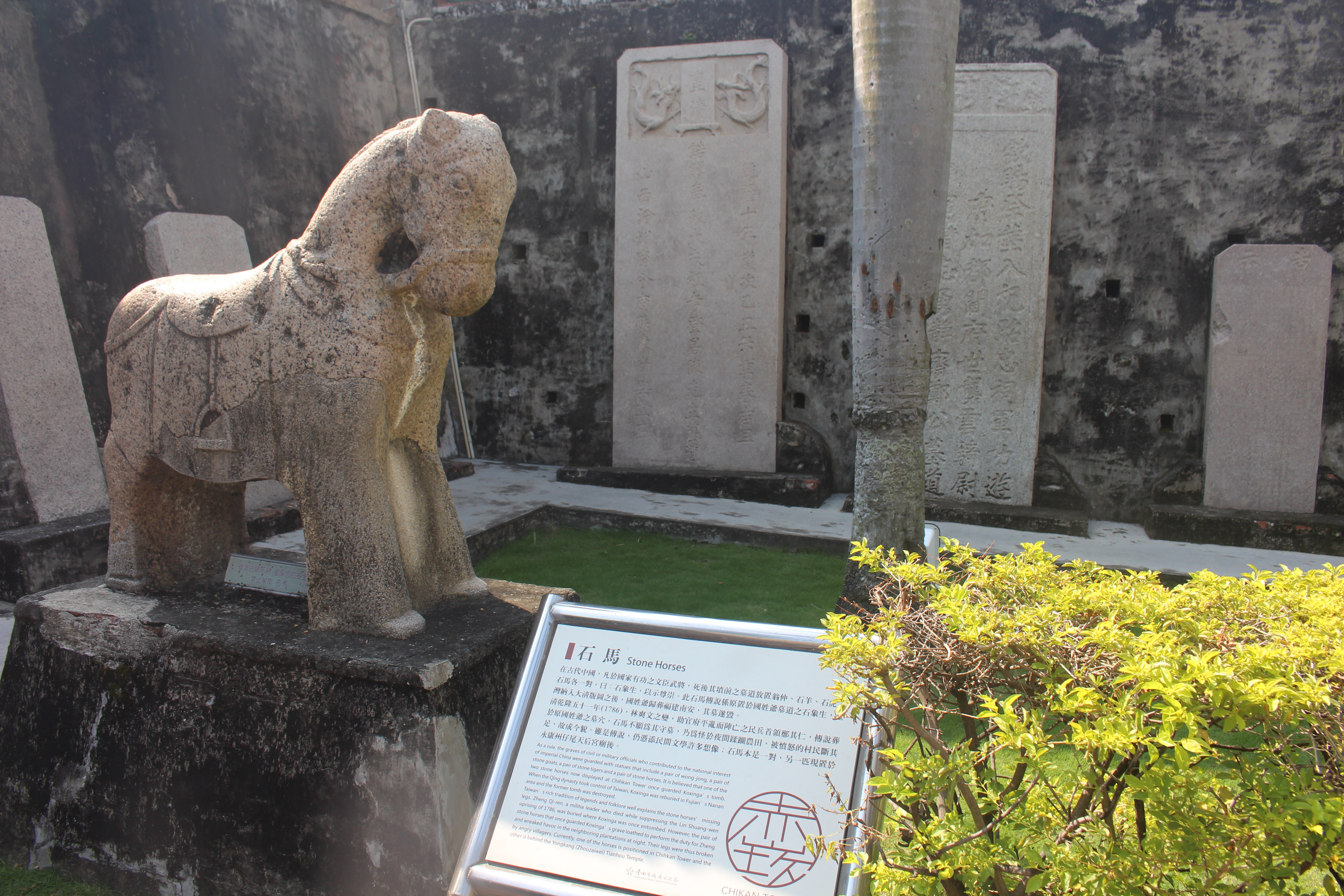 鎮守墓園的「斷足石馬」,前腳是修補過的,傳說這隻石馬入夜後會變成馬跑出玩耍,所以才被斷足。