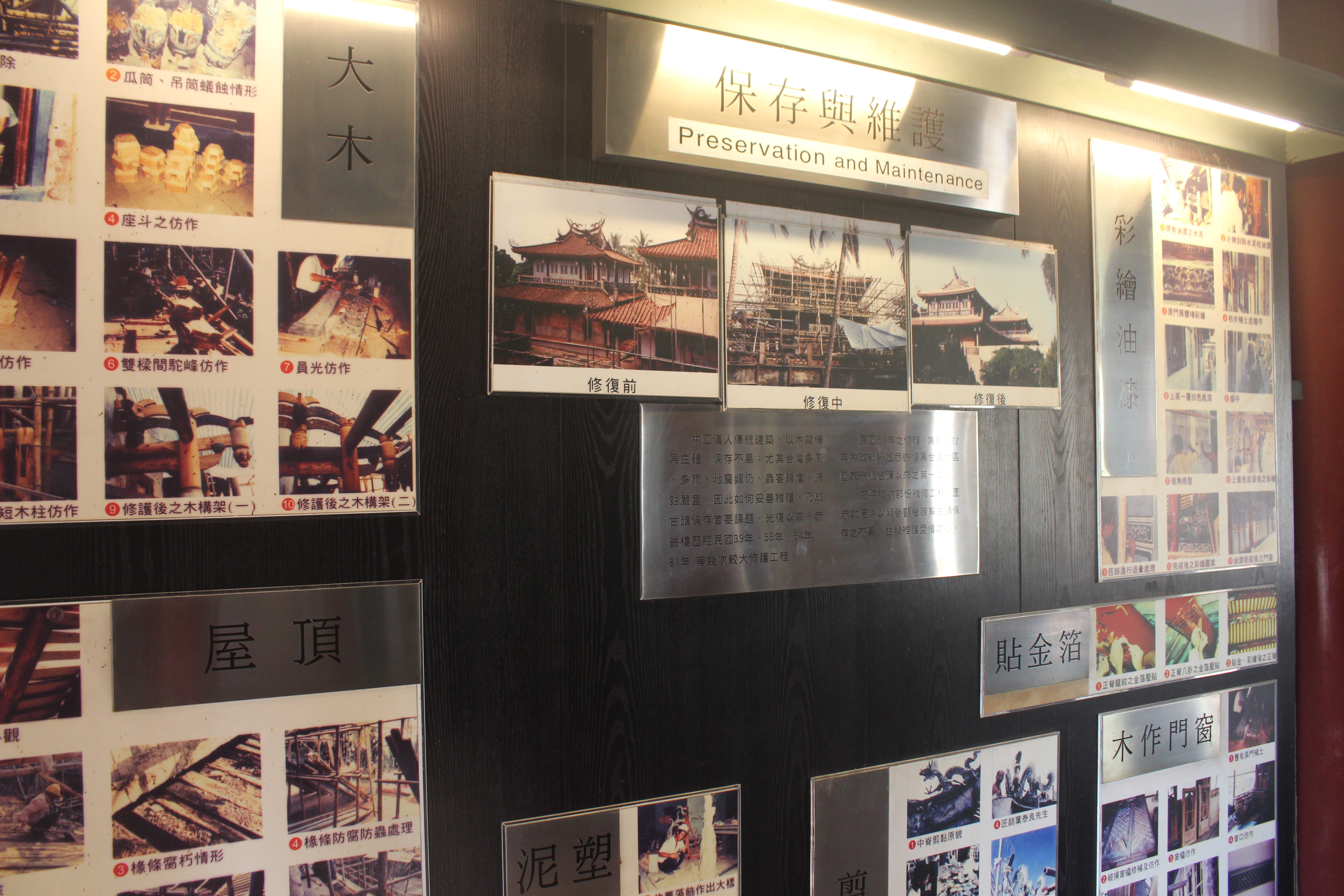 牆上有介紹兩棟建築的修復過程,古蹟的修復,不同於現代鋼筋混凝土建築。尤其中國建築,有些卡榫、梁柱的技術是更加複雜,更有些技術在現代已經失傳。