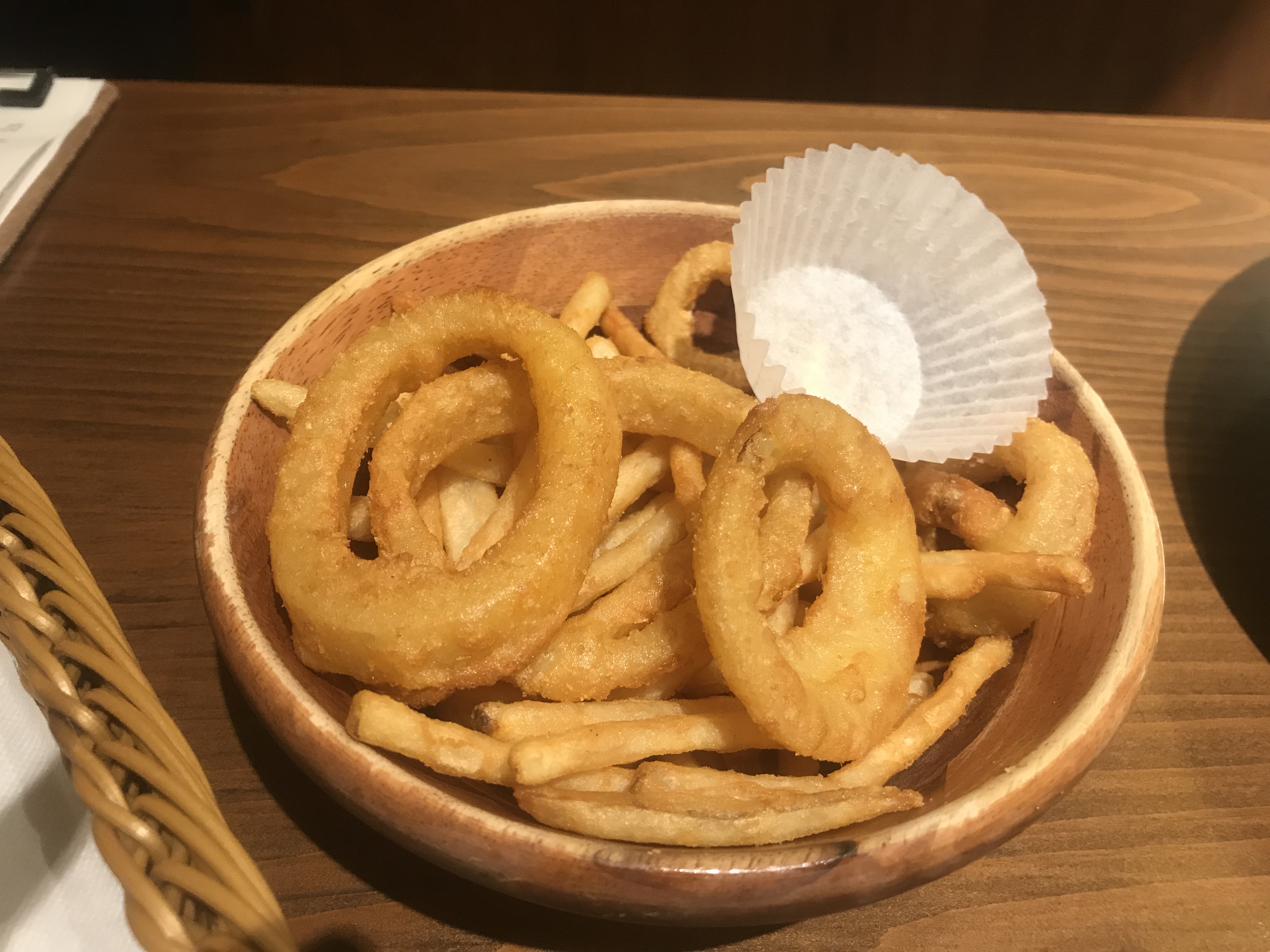 小炸物,薯條跟魷魚圈,口味不會很重。不難吃,也沒特別好吃。或許要配合醬料提味。