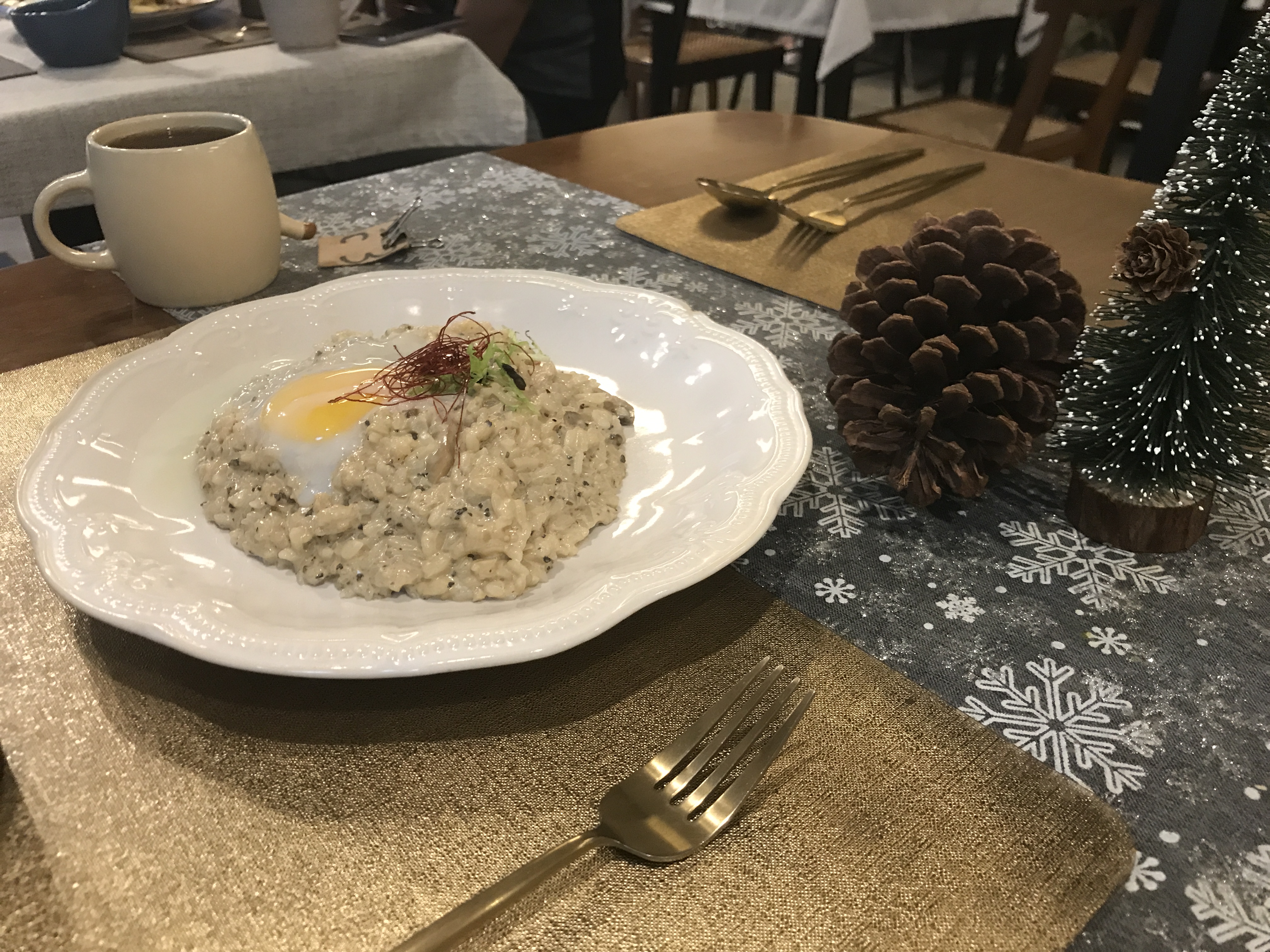 可可女朋友的燉飯,精緻的擺設,配合加了半生蛋的燉飯。胃口頓時好了起來。