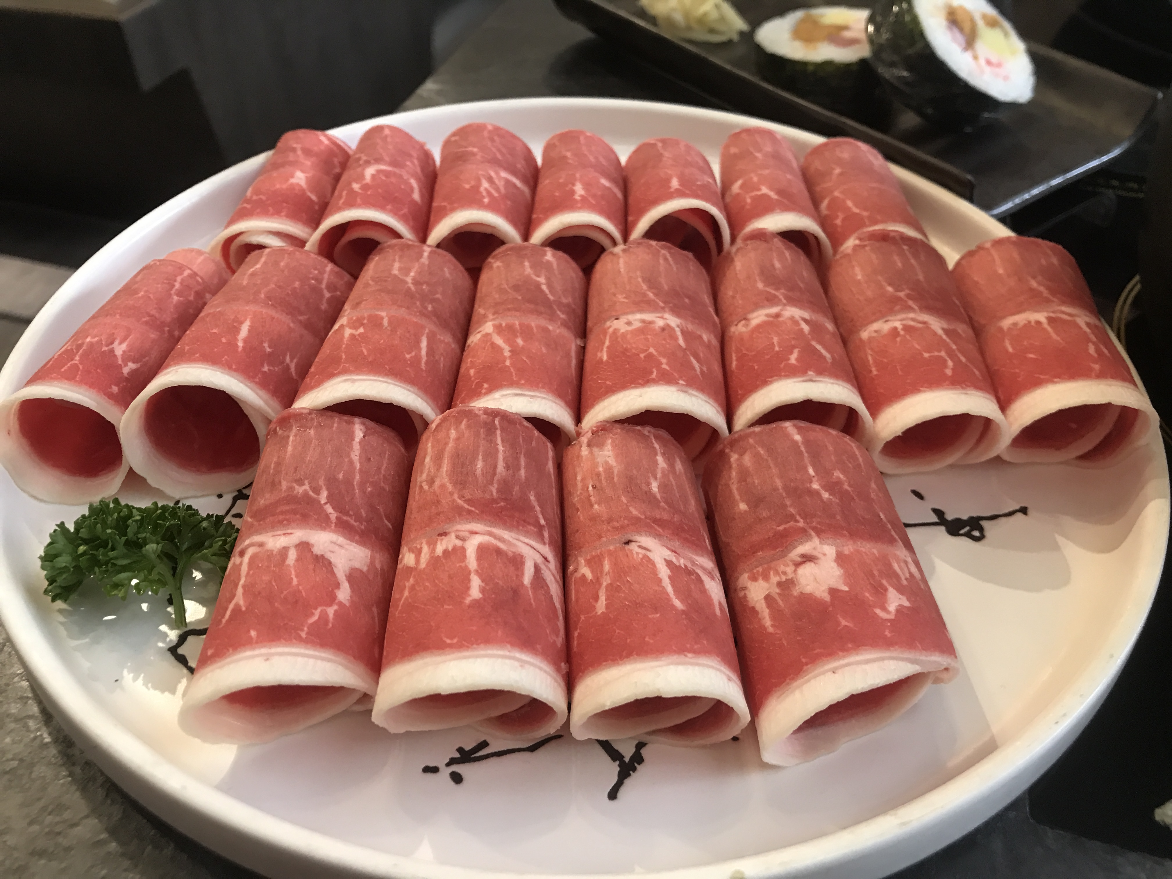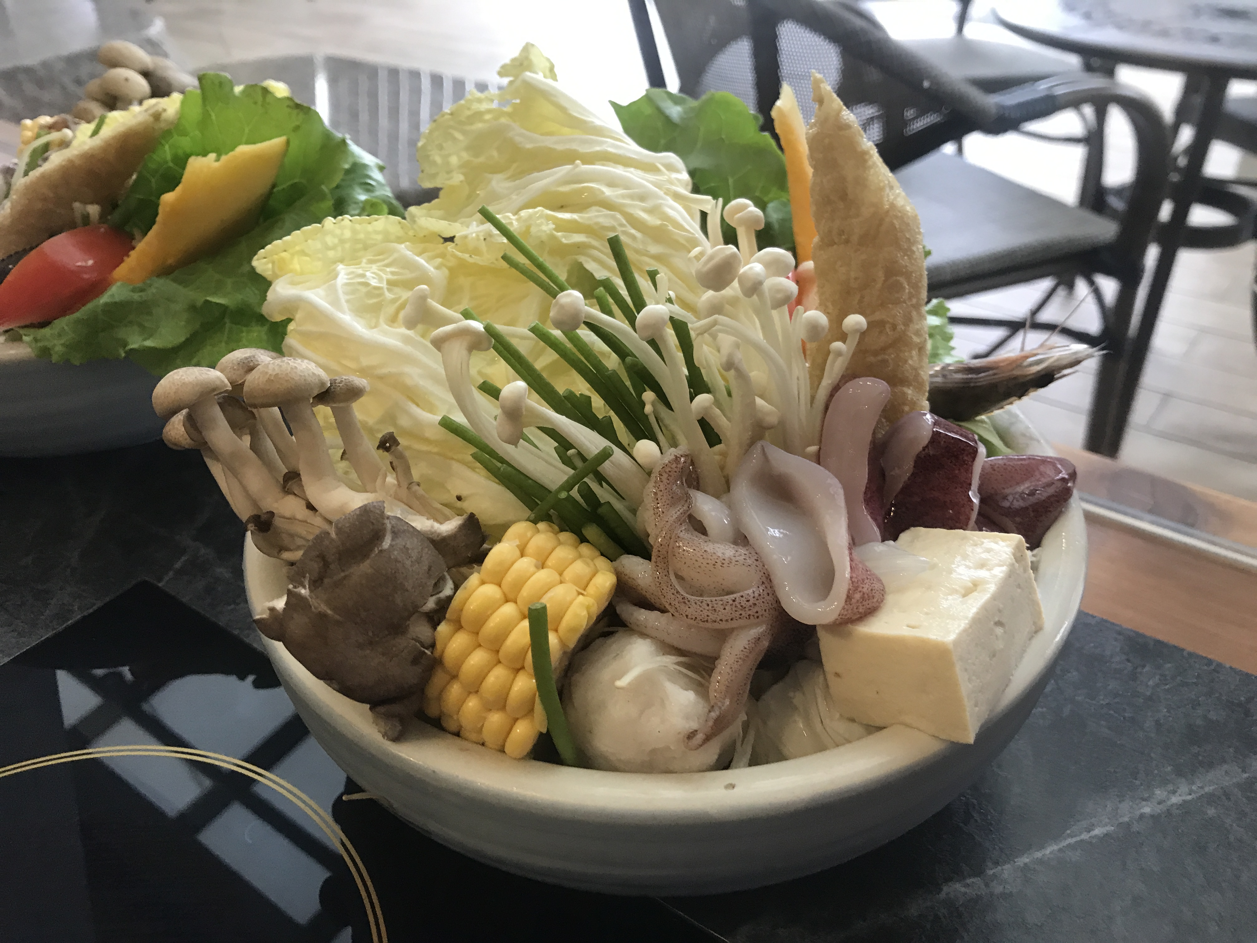 還沒點餐,基本的火鍋菜盤就已先上,有沒有發現,不同於外面的火鍋店,菜盤裡面有肥肥的一隻小卷,不得不說,除了高麗菜比較不推外,店家配料真的很用心。