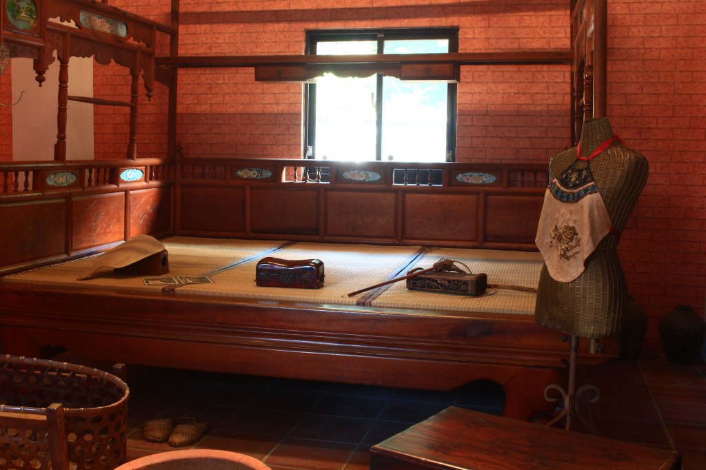 寢室區,沒彈簧床,都是木製、竹編的,睡起來應該很硬。旁邊的肚兜,我一直很好奇,為什麼古時候會發明肚兜,那麼小片真的有功能嗎?