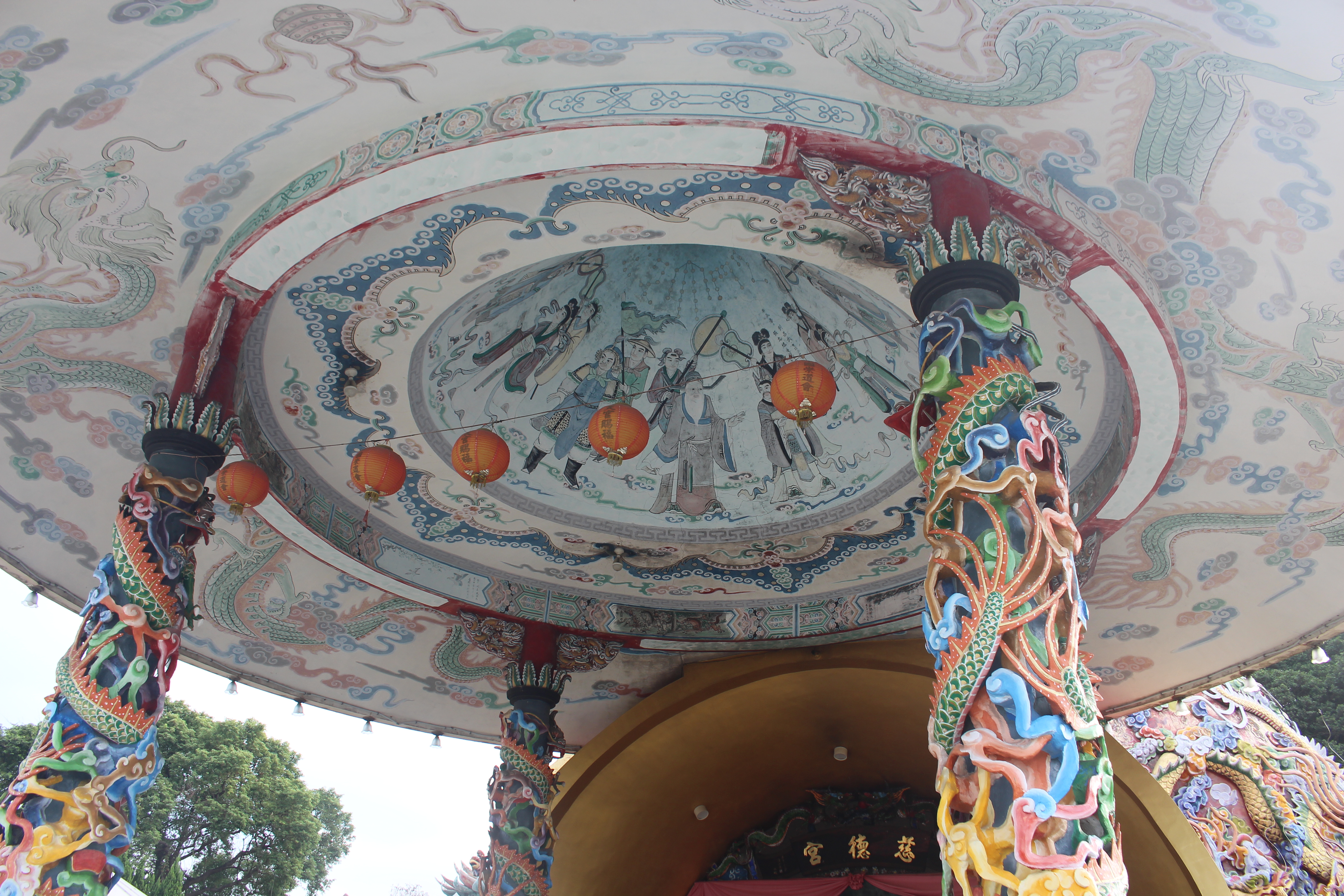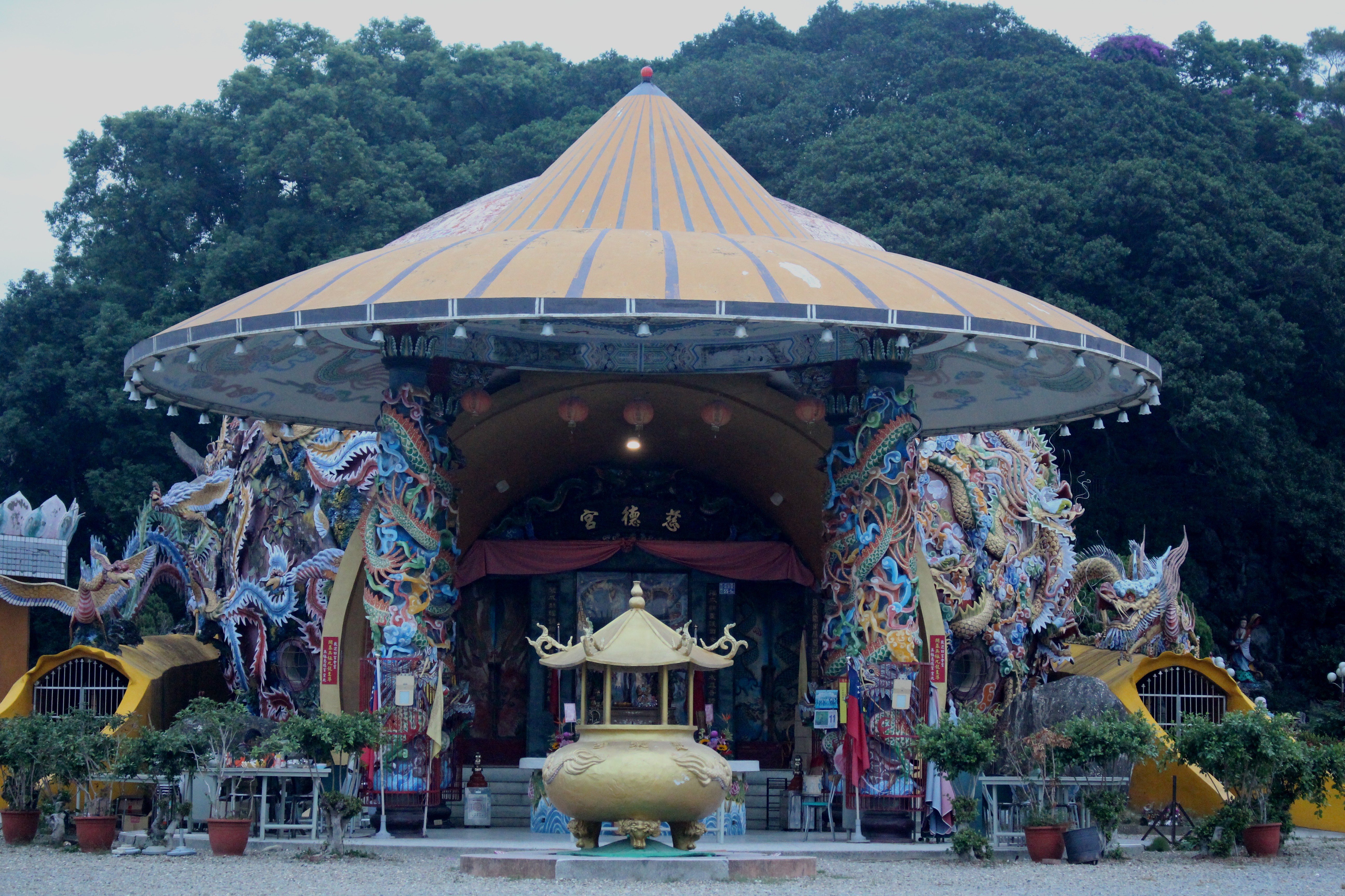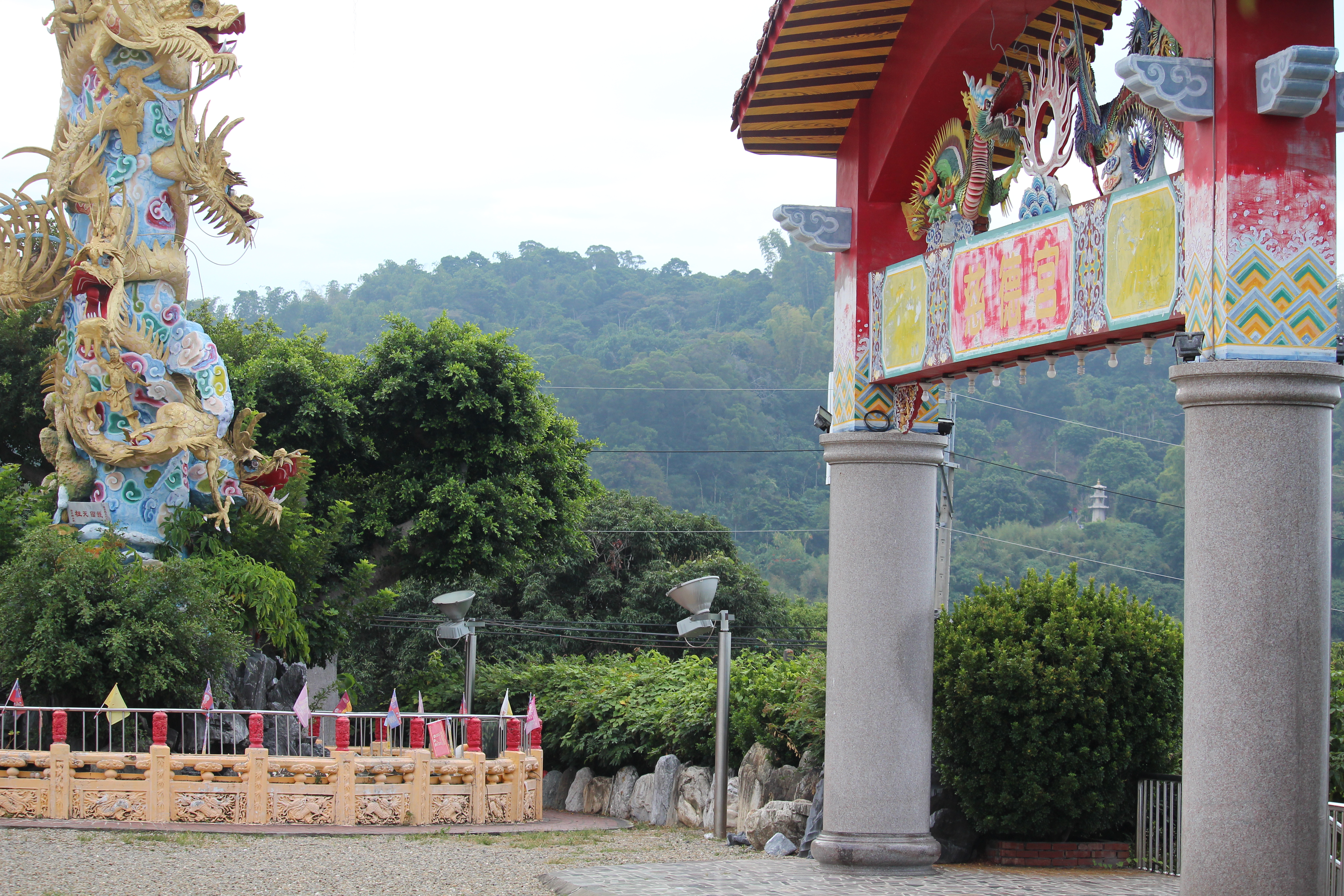 爬上階梯後,首先映入眼前的,是由四根龍柱撐起的斗笠拜亭,全台唯一。先來張正面照,拍得不好,不是我的問題,是天氣太差。