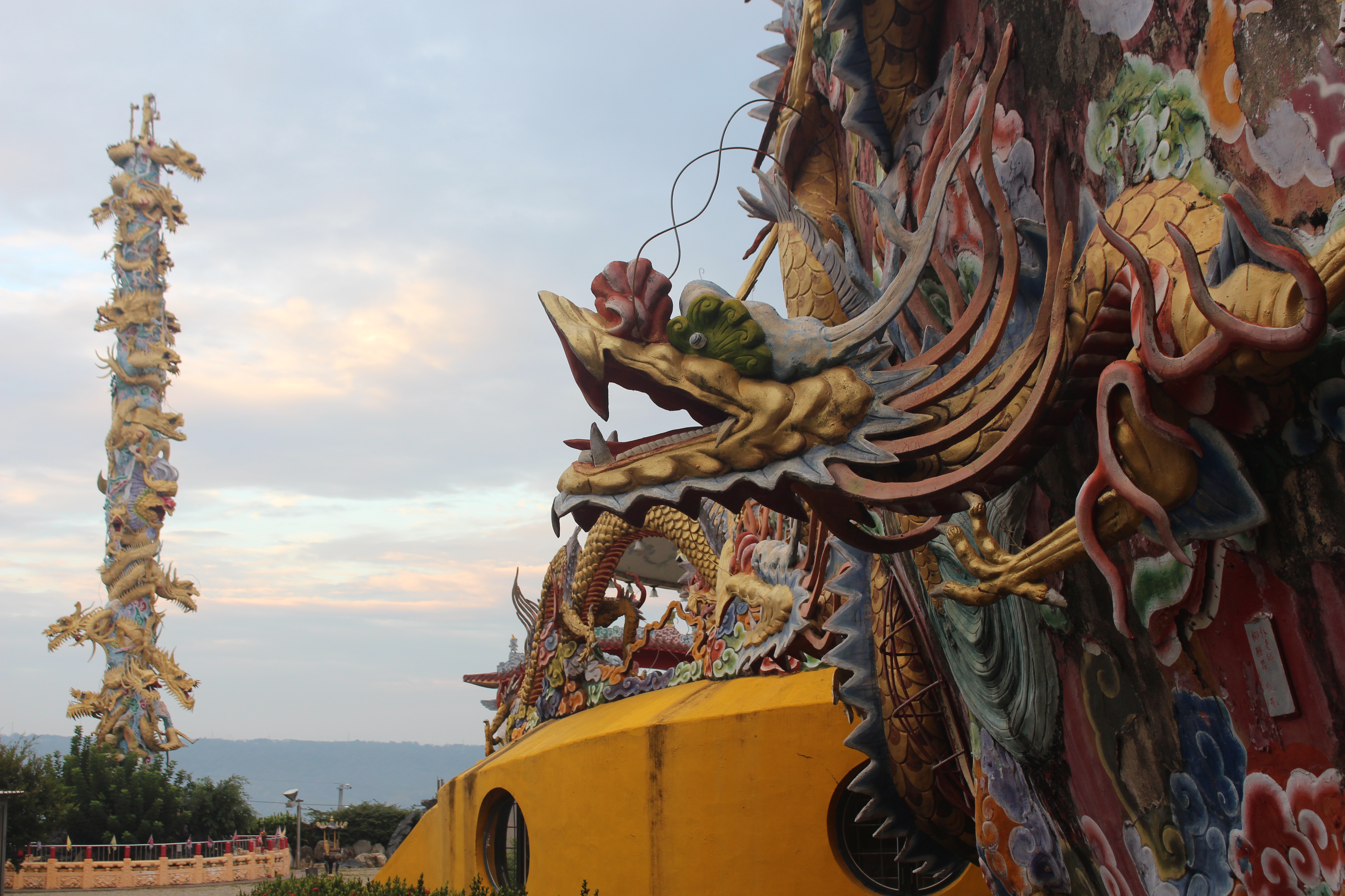 階梯的右手邊,是本篇的主角「十九龍柱」,十九龍柱原名護國神柱,柱高30公尺。底部為蓮花池,柱身上攀著十九尾龍和十八羅漢,頂部則是觀世音菩薩,持淨瓶柳枝,象徵普渡蒼生。另外,每條龍的眼睛上還各裝著燈光,在晚夜時,可可家常能看到龍柱燈火通明。