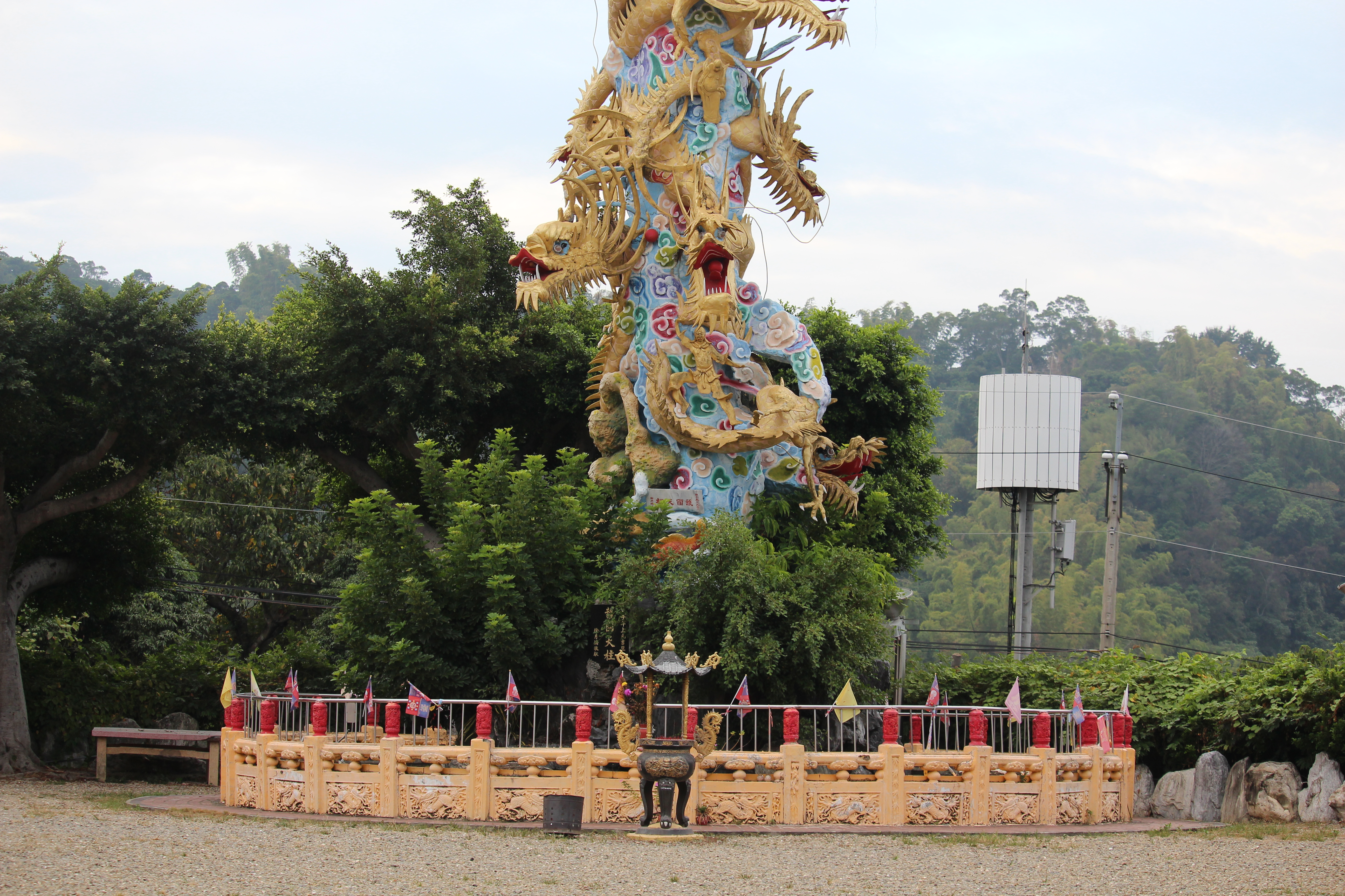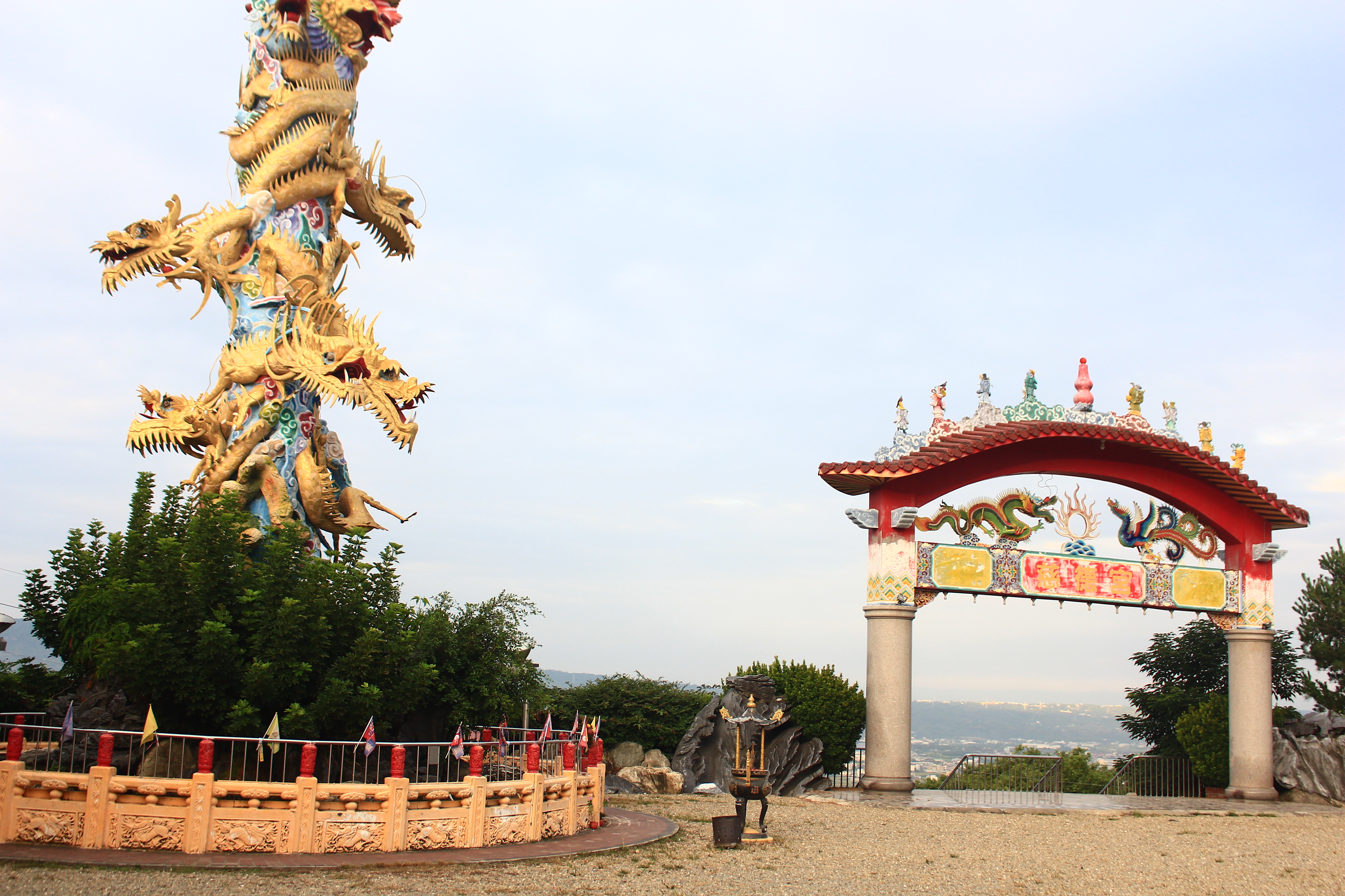 After climbing up the stairs, the first thing that comes into view is the hat worship pavilion supported by four dragon pillars, the only one in Taiwan. Let’s take a frontal photo first. It’s not my problem, but the weather is bad.