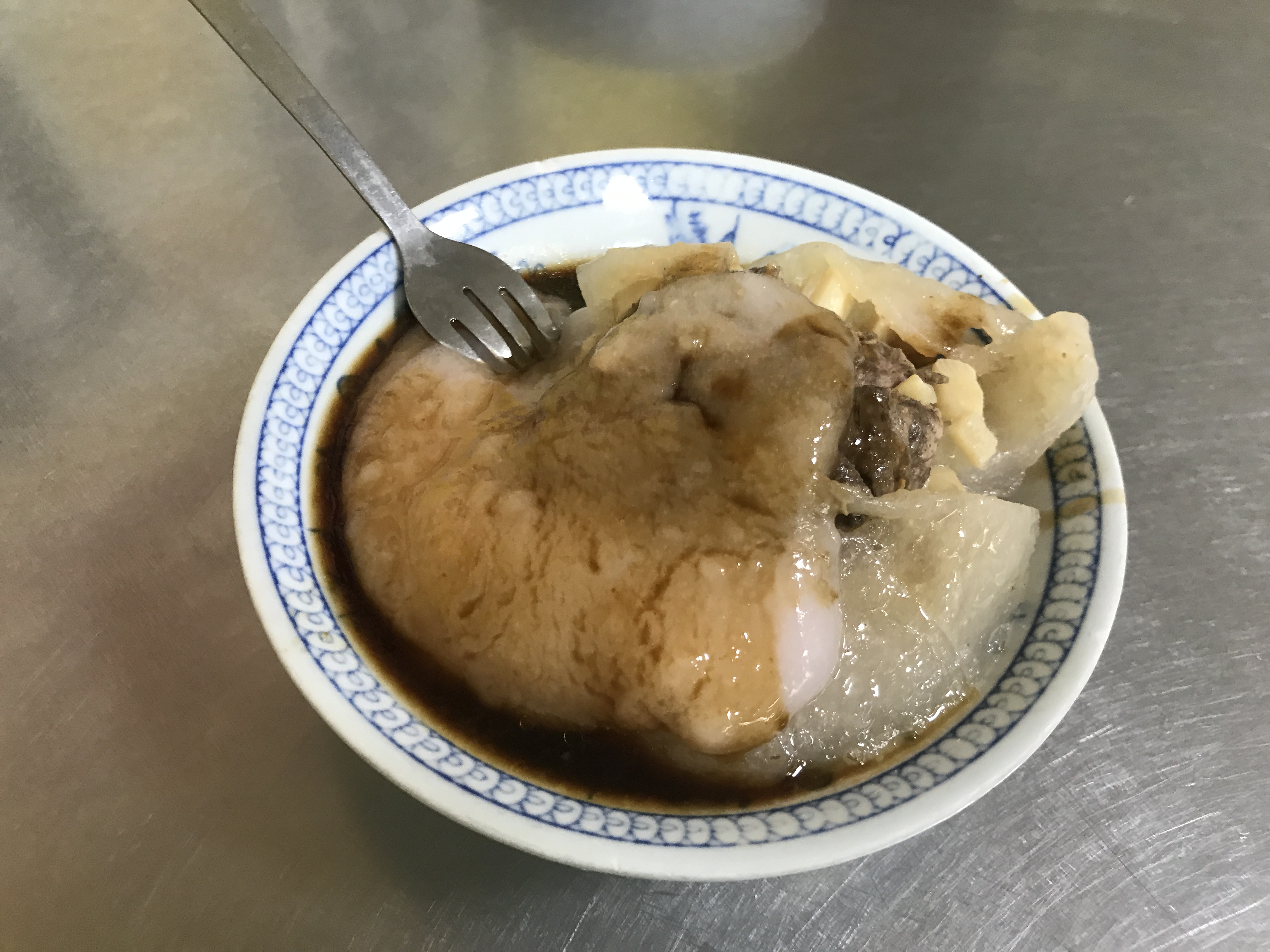董家肉圓有一種很特別的吃法,就是先把皮吃掉,然後在去旁邊淋上特別熬煮的大骨湯。