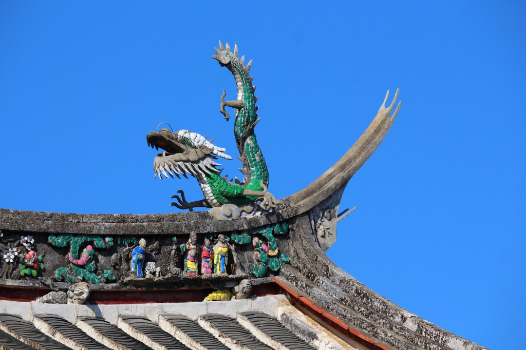 不只是三燕尾翹脊,屋頂上揚捲的龍,搭配許多的人物雕飾,三者結合出一幅相當精美的畫面。