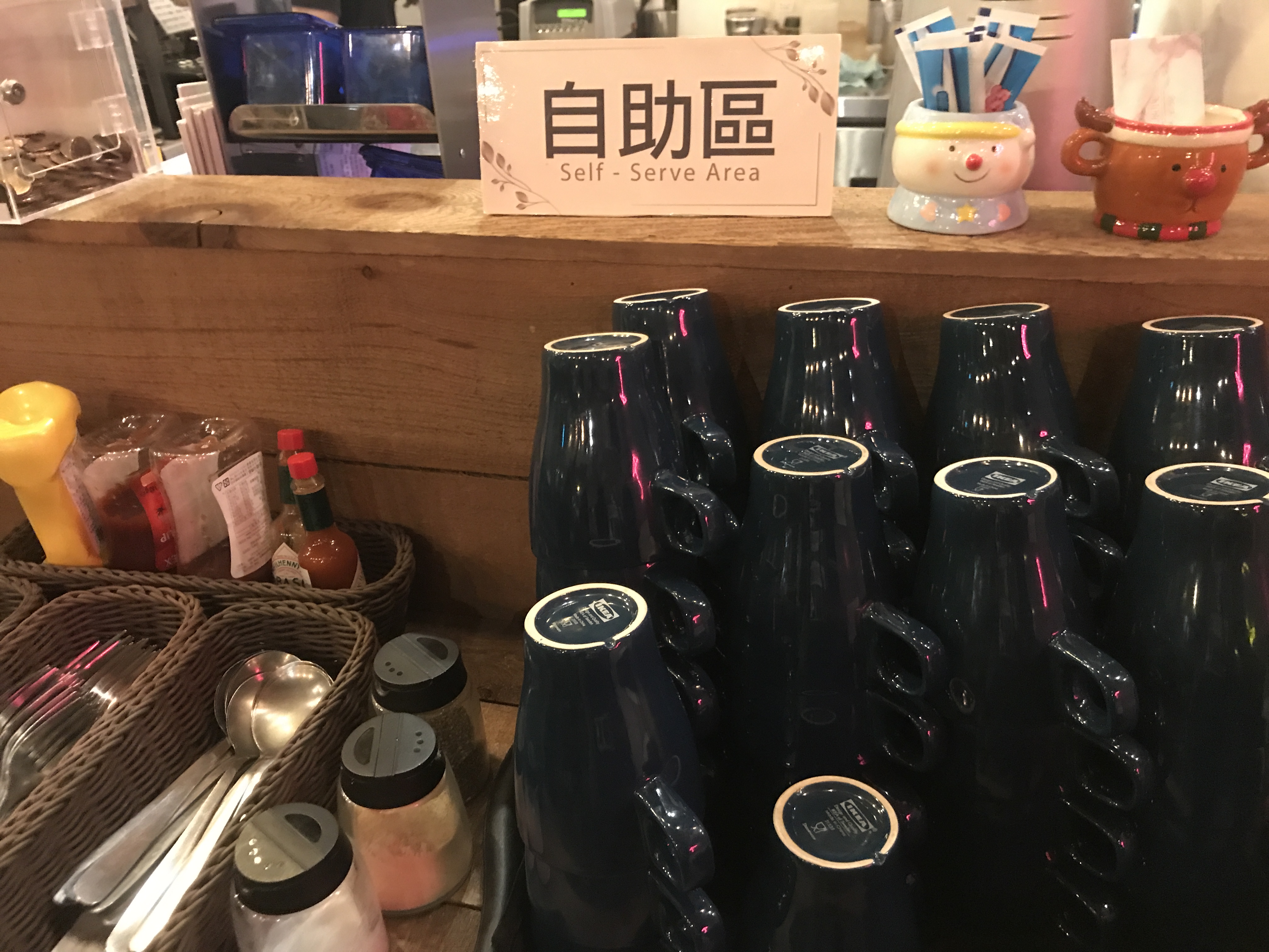 The tableware and water are self-service, and besides the simplicity, the cups are also very industrial.