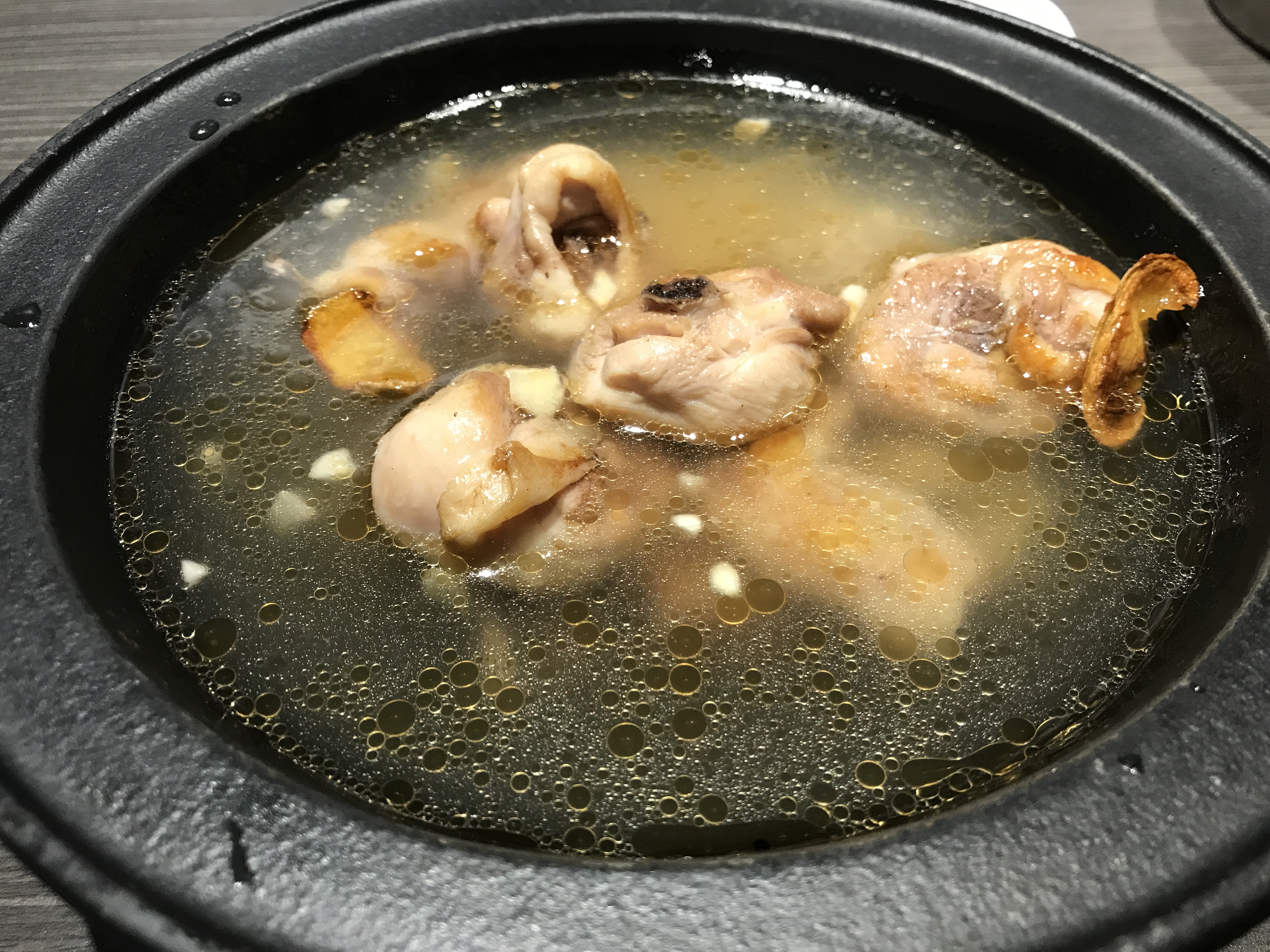 招牌是炒雞鍋,蒜頭過的湯頭,會散發出一種特殊的氣味。湯頭香甜不油膩,最重要的是雞肉,十分有嚼勁,且肉質不會太老。