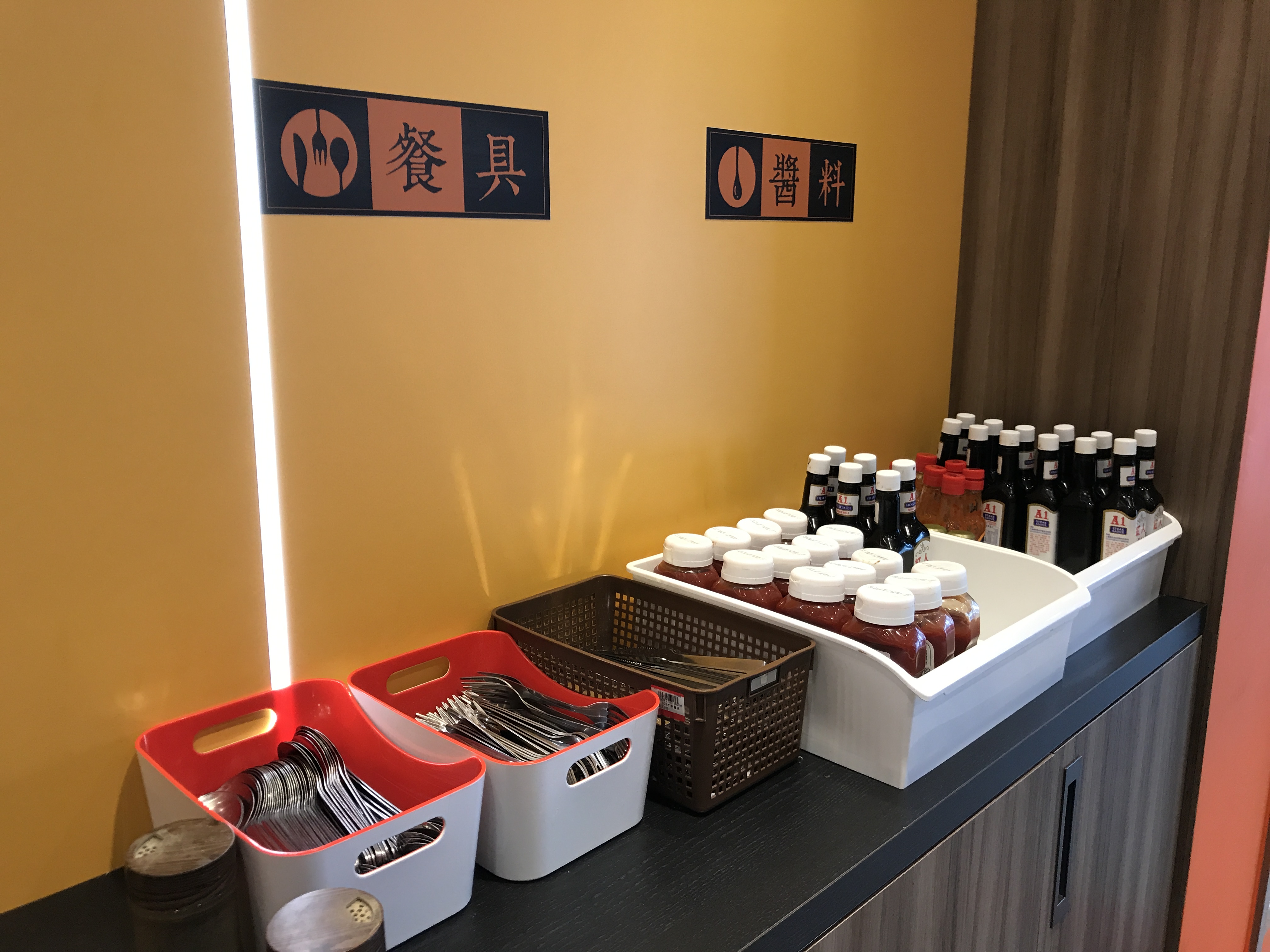 餐具跟醬料是自助式的,集中擺設,讓整體環境看起來顯得乾淨整齊。