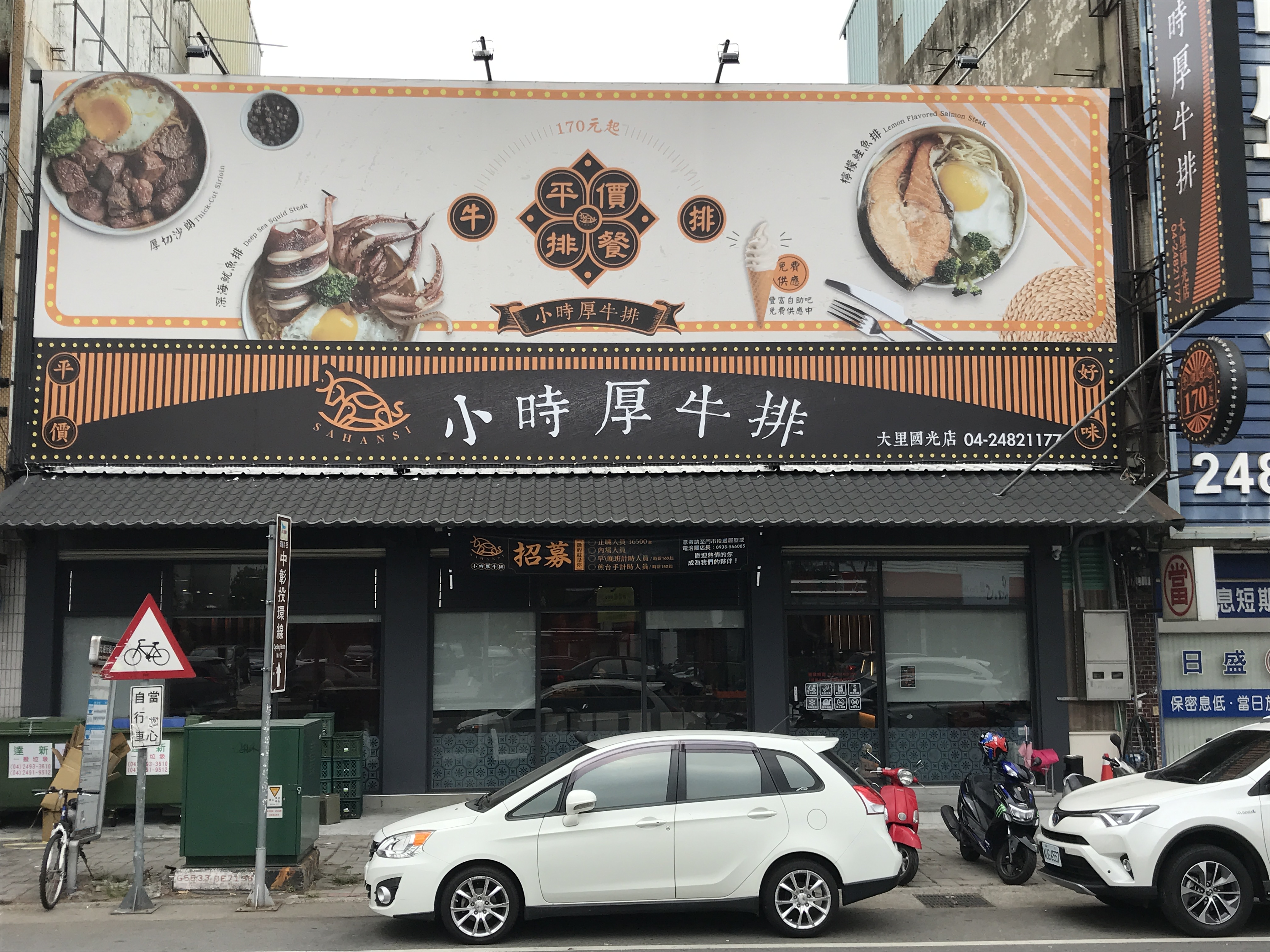 這是一個環島回來的慶祝,地點位於台中大里的平價牛排館「小時厚牛排」,起源北部的「小時厚牛排」連鎖店,開店於國光路的路邊,招牌相當顯眼,因為可可是中午過後才來用餐,所以路邊停車方面也還算方便,不過熱門時段可能還是要找一下停車位。