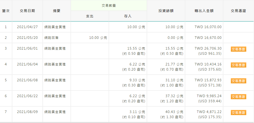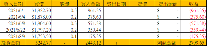 再看看可可最近的買賣紀錄,扣除了1、2筆已完成交易的台幣買賣。可可目前投資在黃金裡面的總金額為2443.12美元,與銀行剩餘的2799.65美元得到可可總共有5242.77美元。