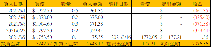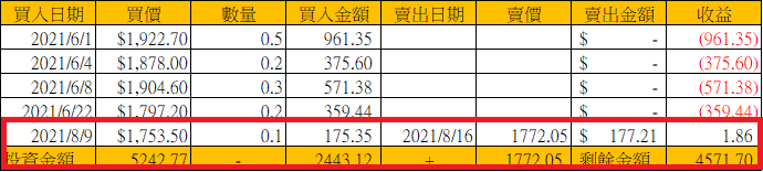 Cocoa bought gold at $175.35 on August 9, 2021, and sold it at $177.21 on August 16, 2021. It made a profit of $1.86 in 7 days. It doesn’t seem to be very profitable. In addition, I found that the bottom summary formula should have a setting error, and the remaining amount should be mistakenly added to the selling price amount.