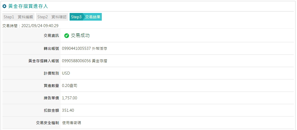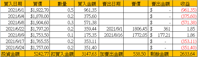 買入了0.2盎司,在2021年9月14日以351.4美元買進。看了一下收益,滿滿的紅字,看起來要在黃金存摺上獲利,真的不是件簡單的事情。END