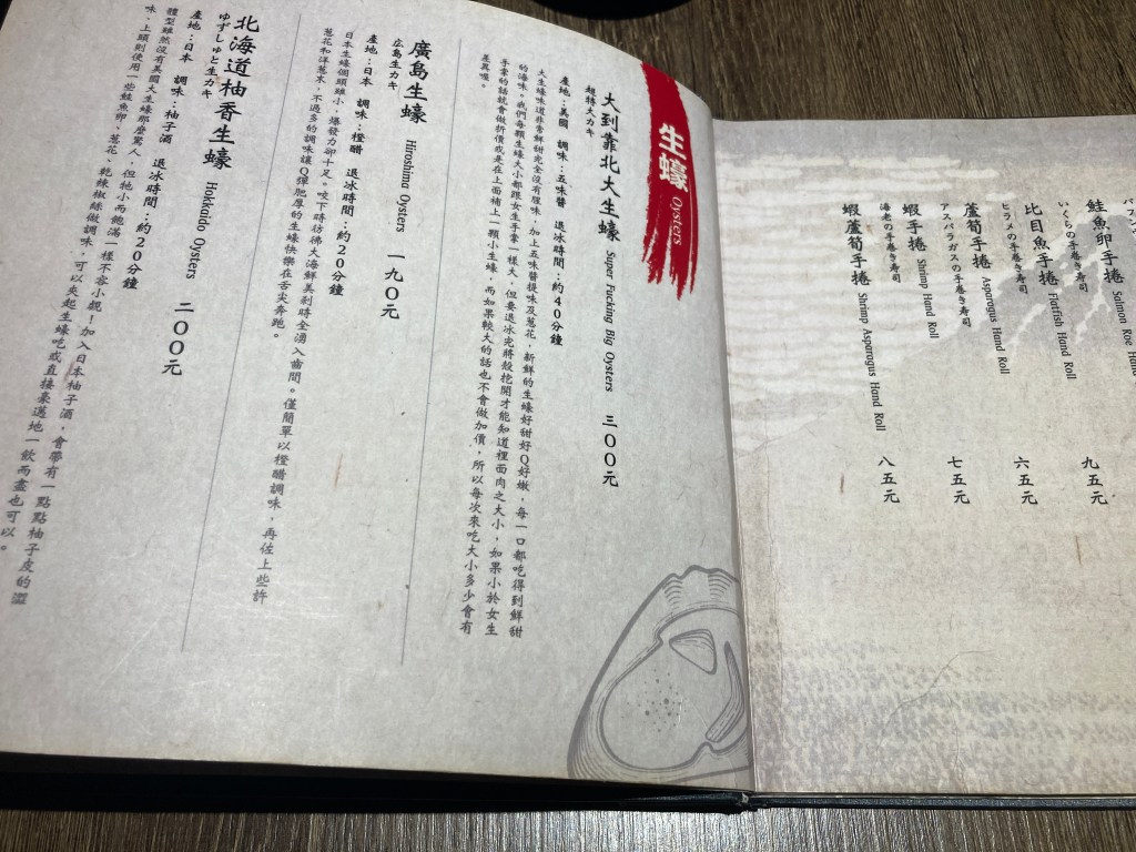 The meals are à la carte. The dishes are roughly the same as other izakayas. Sashimi, barbecue, and deep-fried dishes. The General’s Mansion has a very famous dish. The Recommended on the Internet “Super Fucking Big Oysters". Because the quantity of this dish is limited, it is recommended that friends who are interested in tasting this dish ask in advance before making a reservation.