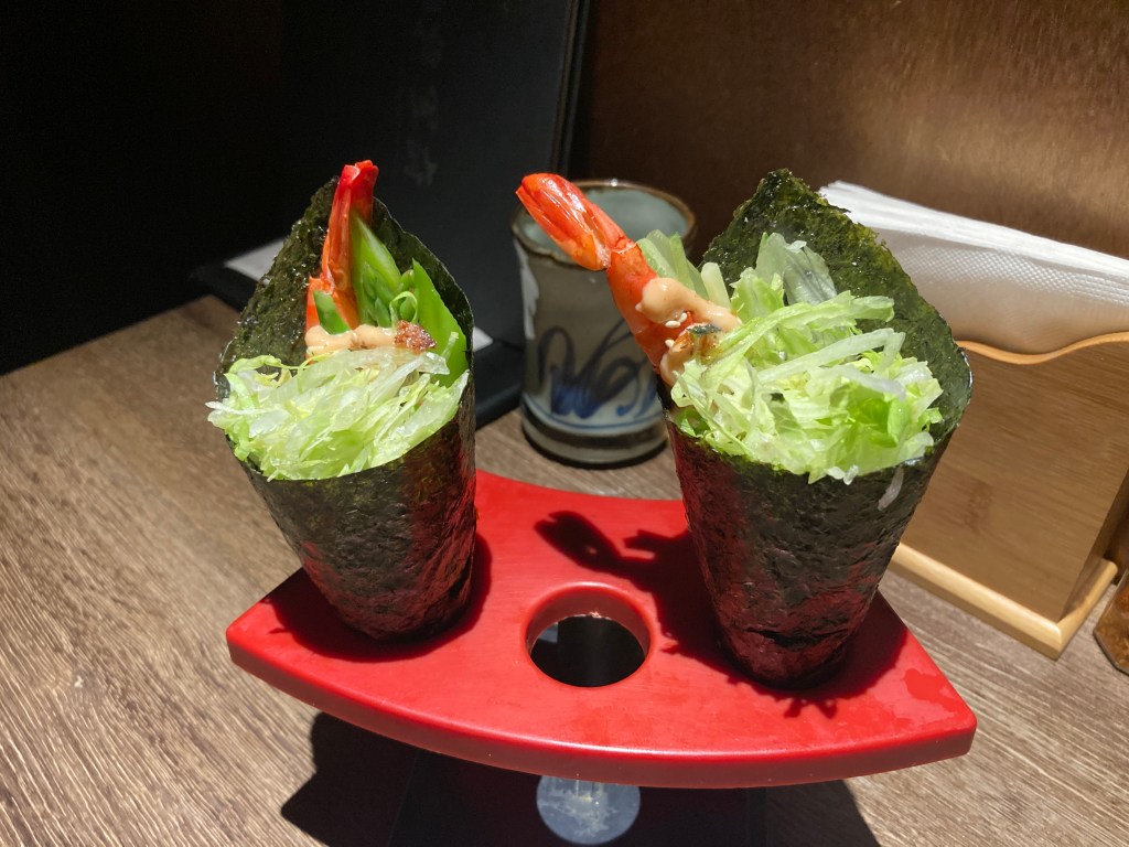 蝦手卷是將鮮蝦搭配生菜淋上美乃滋後用海苔捲起。記得提早食用,避免海苔遇到美乃滋軟化影響脆脆的口感。