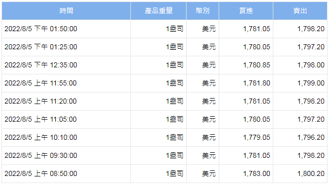 2022年08月05日,可可看一下當日銀行的買入價格,約在1781美元左右。銀行的黃金交易有買入跟賣出兩種價格。約有17美元左右的價差。