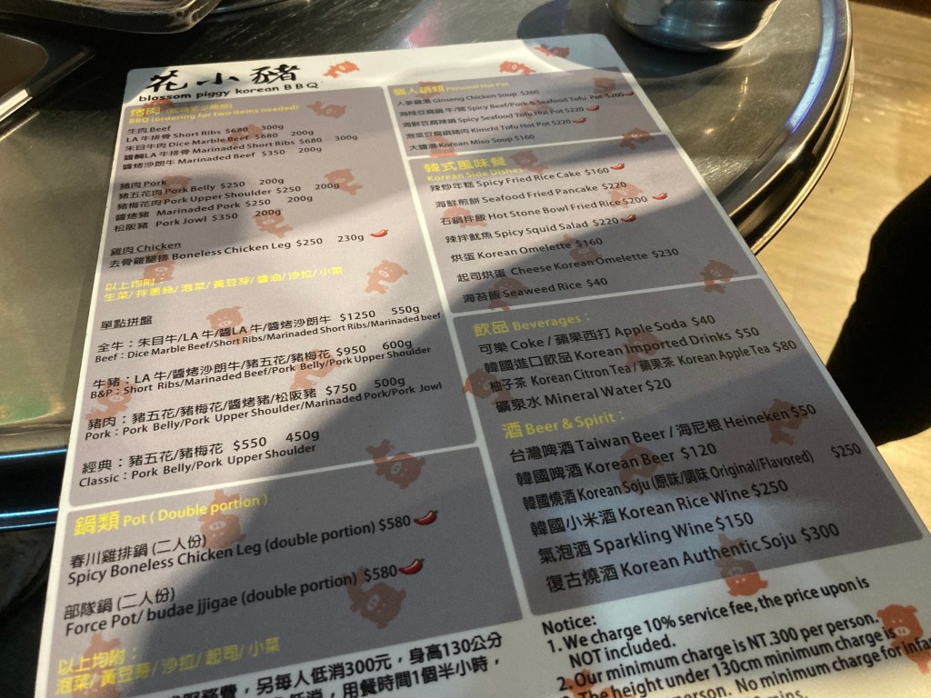 There are quite a lot of types of menus. Generally speaking, they are divided into barbecue, pot, and Korean-style meals. The meal time is 90 minutes, the minimum personal consumption is 300 TWD, and a 10% service fee will be charged. We ordered a set meal for two.