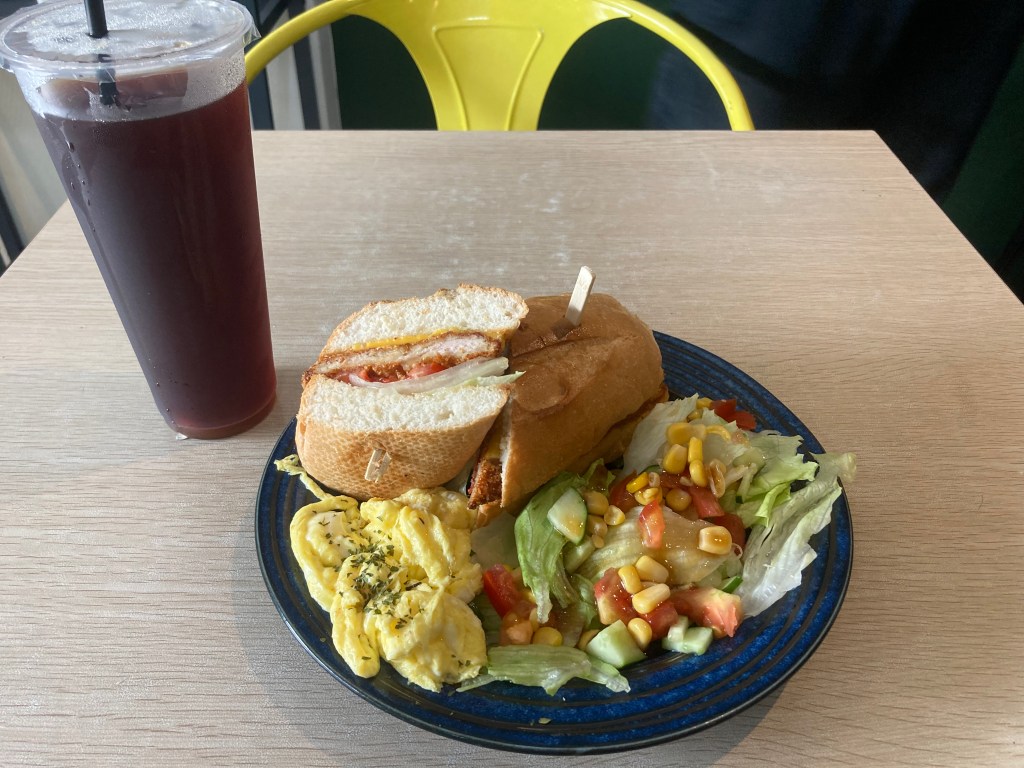 The French brunch set includes eggs, lettuce, tonkatsu burgers, and black tea. The portion is quite substantial. And it only costs 149 TWD, Coco thinks that the CP value is quite high.