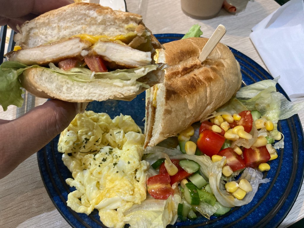 炸豬排堡的內餡也不馬虎,除了炸豬排外有生菜、吉士片、番茄,麵包烤得有些乾硬,有些小小失敗。