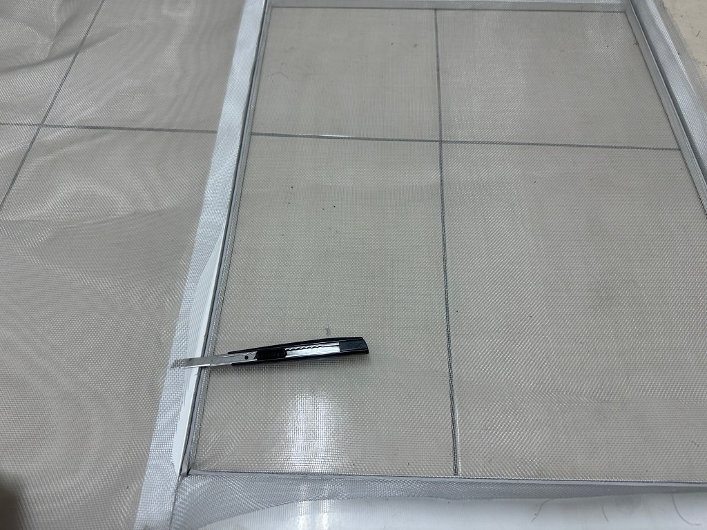 壓完壓繩後,接著就是裁切多餘的紗網。用美工刀沿著鋁窗邊切掉。這樣就相當美觀了。