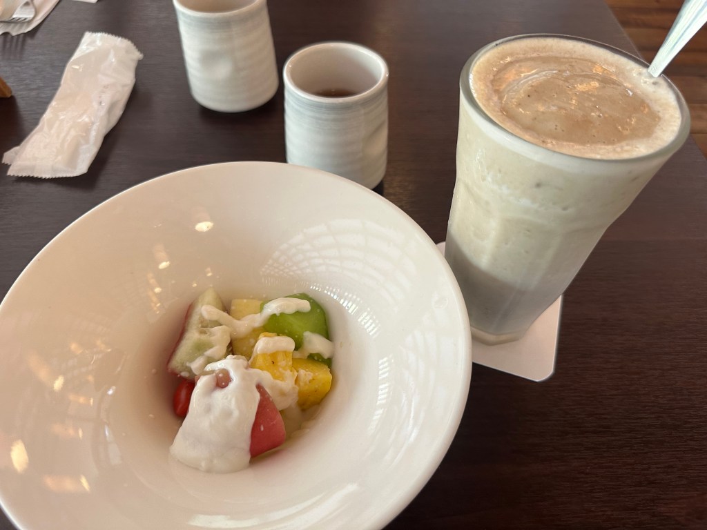 Back at the table, the waiter brought appetizers and drinks. The fruit salad was not bad, and the drinks were not bad.