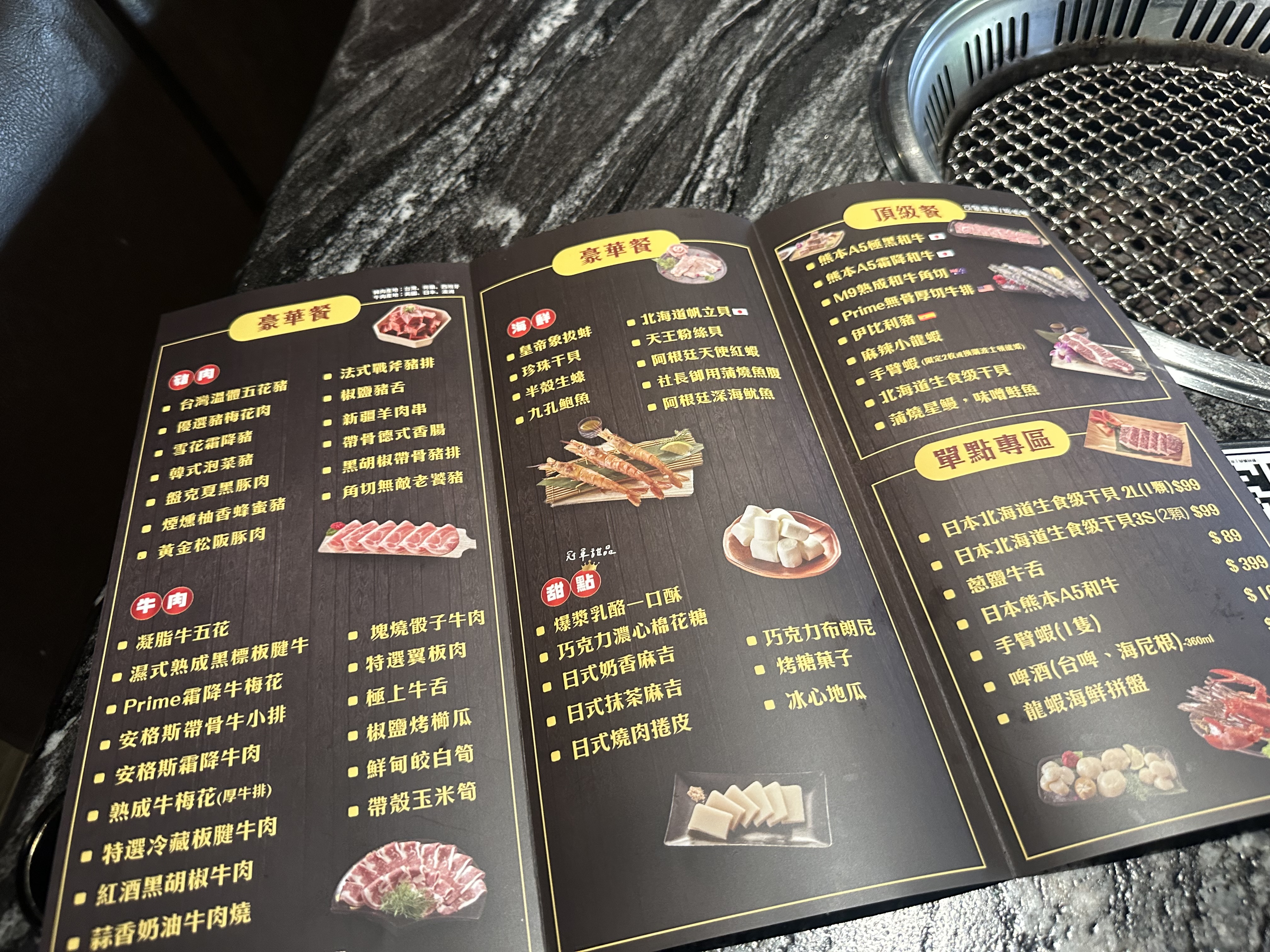 因為是特別假日的關係,店內只提供豪華餐與頂級餐,兩者的差異在於是否有A5和牛的提供。另外,店內也提供特殊食材的單點。